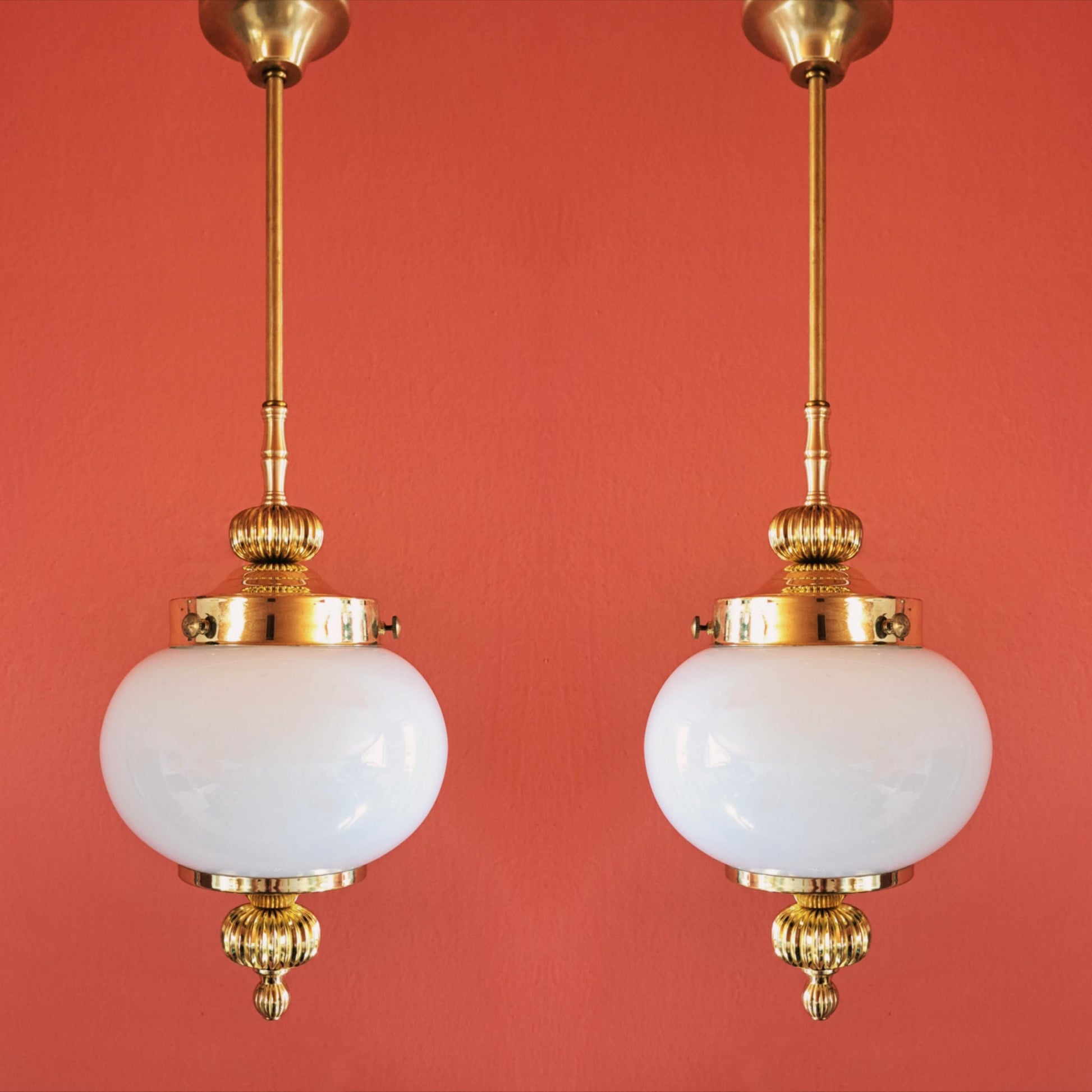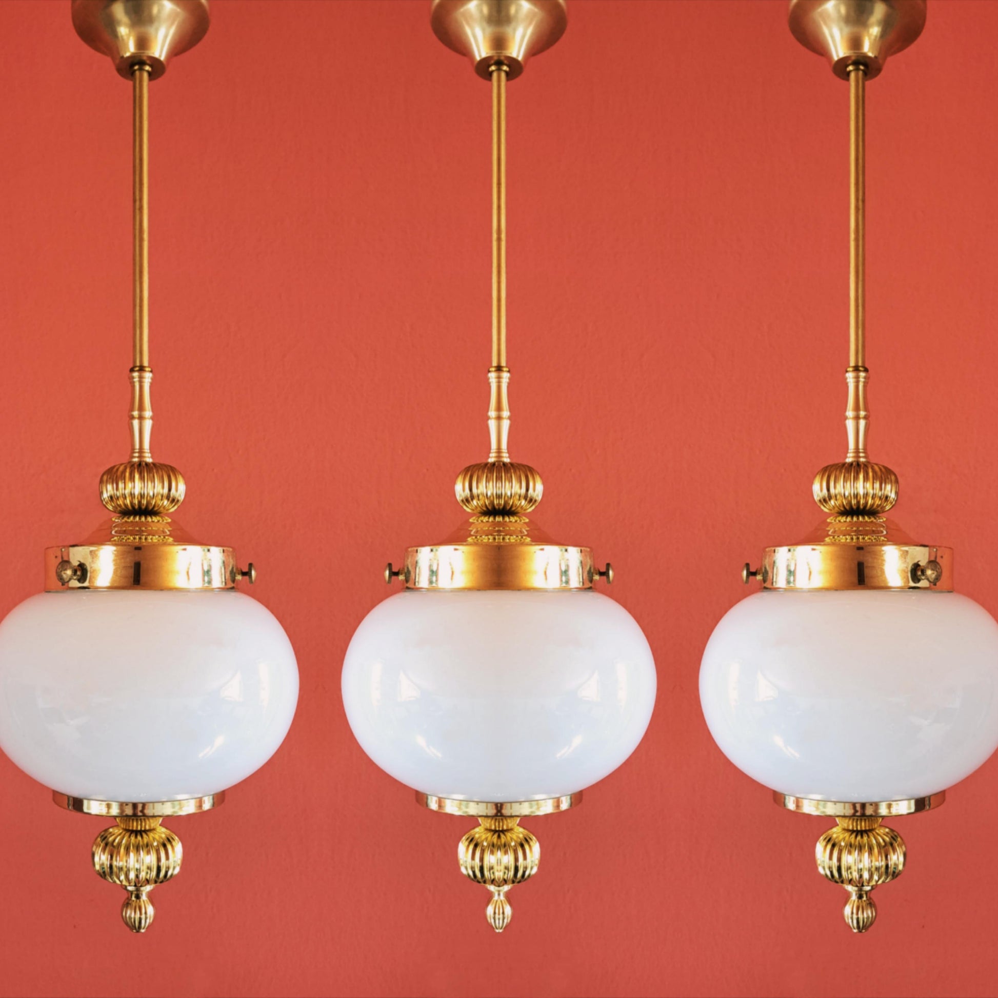 Mid Century Opaline Glass Viennese Brass Pendant Lights MULTIPLES AVAILABLE