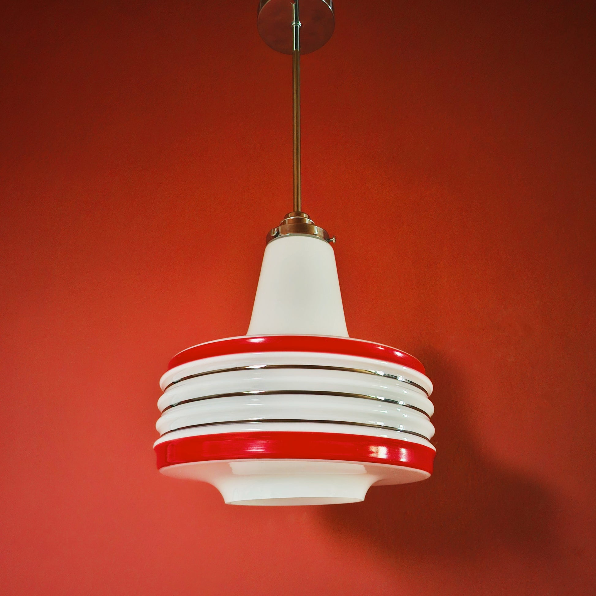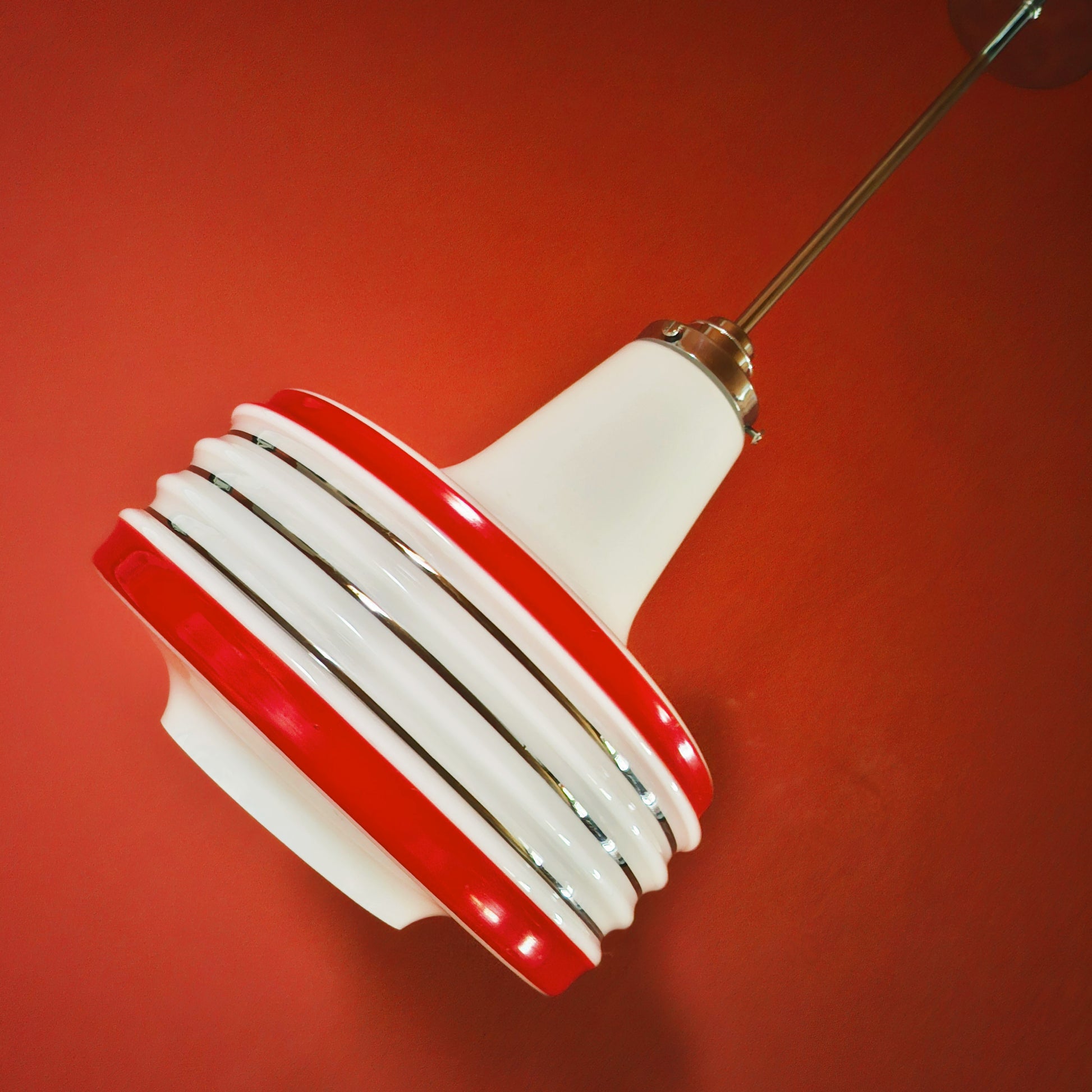 Vintage Opaline Red Striped Glass Pendant Light 1960s Retro Space Age Light